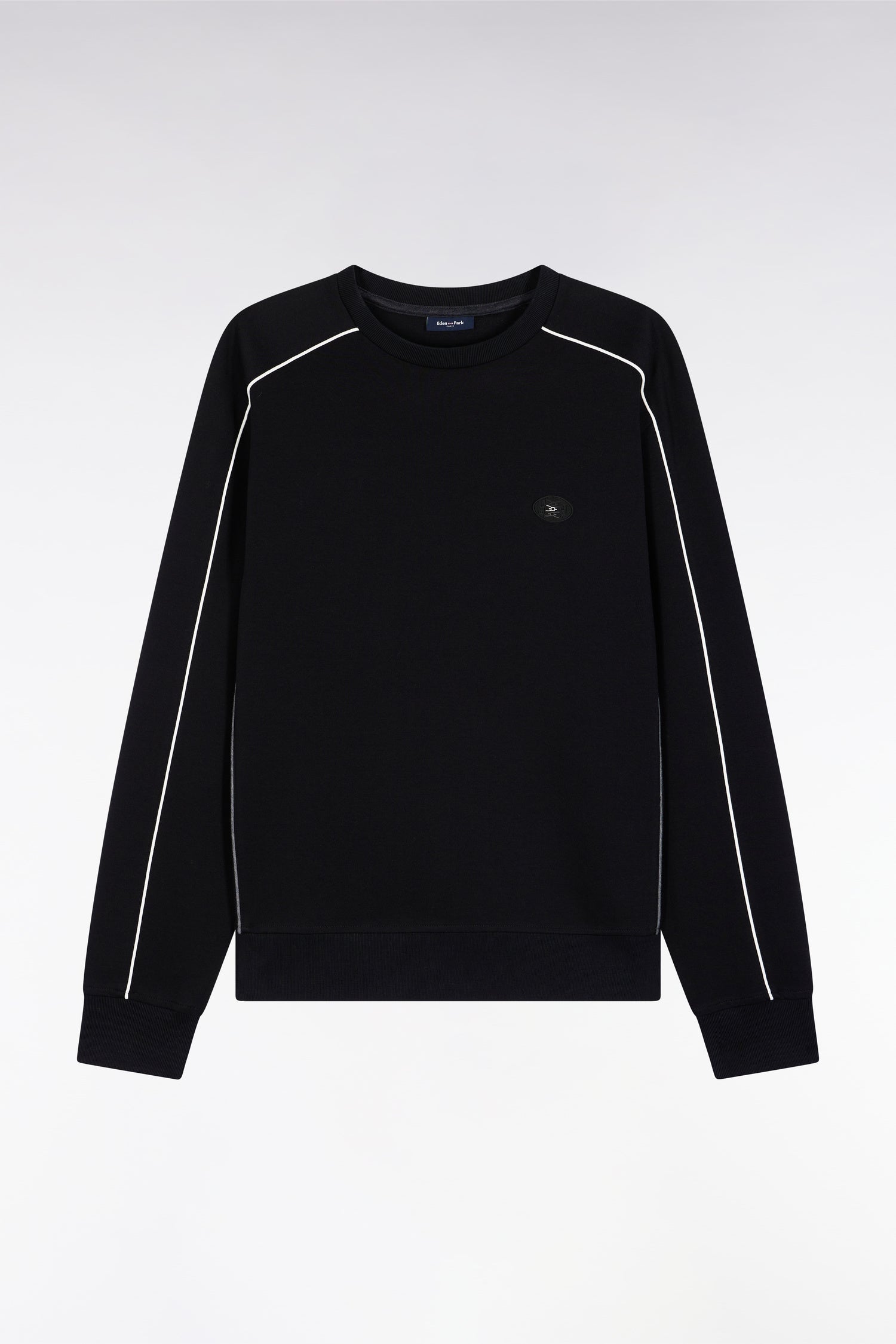 This round-neck sweatshirt in a brushed cotton fleece blend combines comfort and character. Available in black or navy, it features back embroidery with raised contours and contrasting piping to enhance the silhouette. The ribbed neckline and cuffs reinforce the structured look of this sporty-chic model, emblematic of the Eden Park wardrobe.