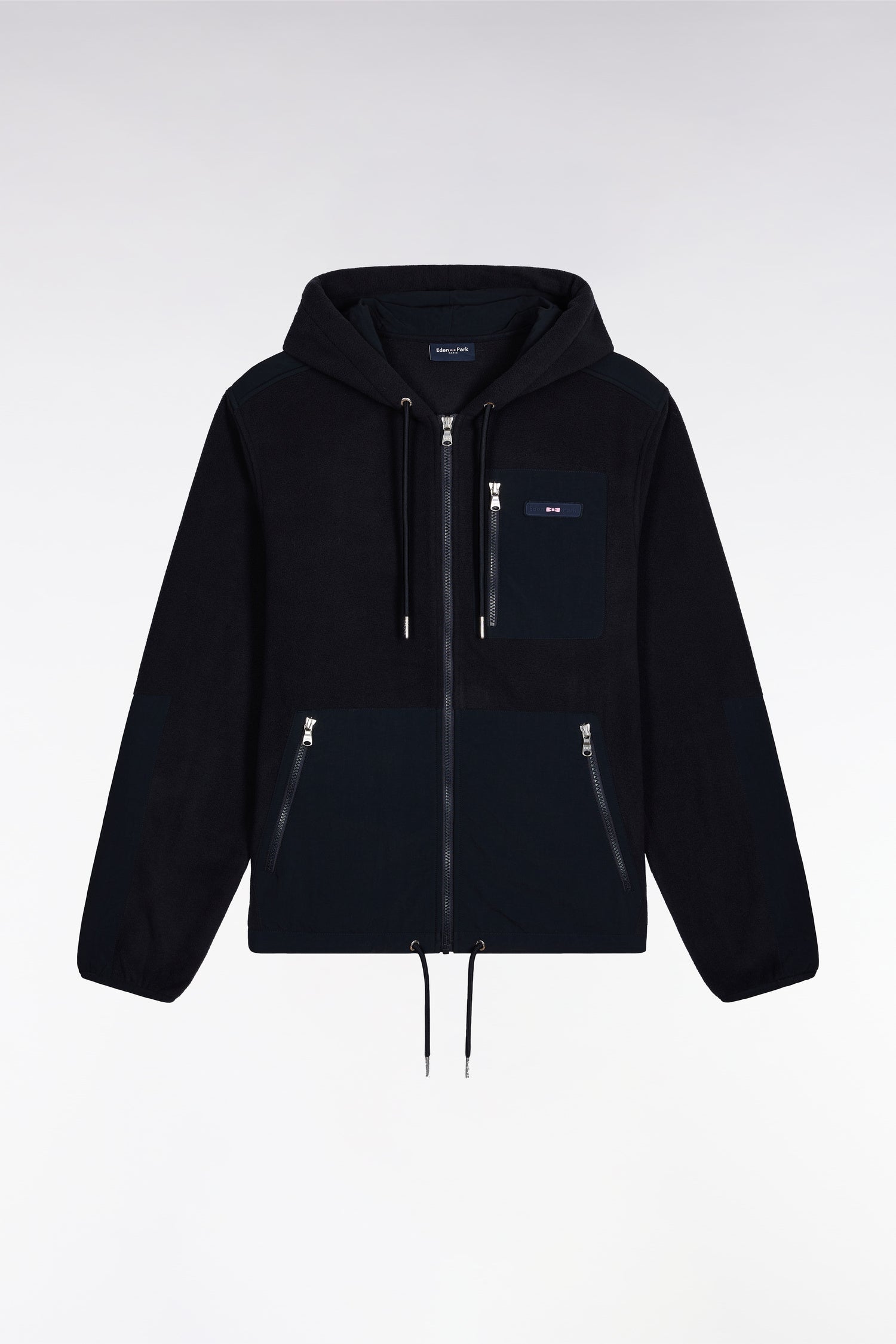 A combination of technical style and contemporary allure, this zipped jacket is a must-have this season. Contrasting nylon inserts underline a graphic silhouette, reinforced by shiny metal zips and a wraparound hood. An audacious model, at the crossroads of jacket and streetwear sweatshirt.