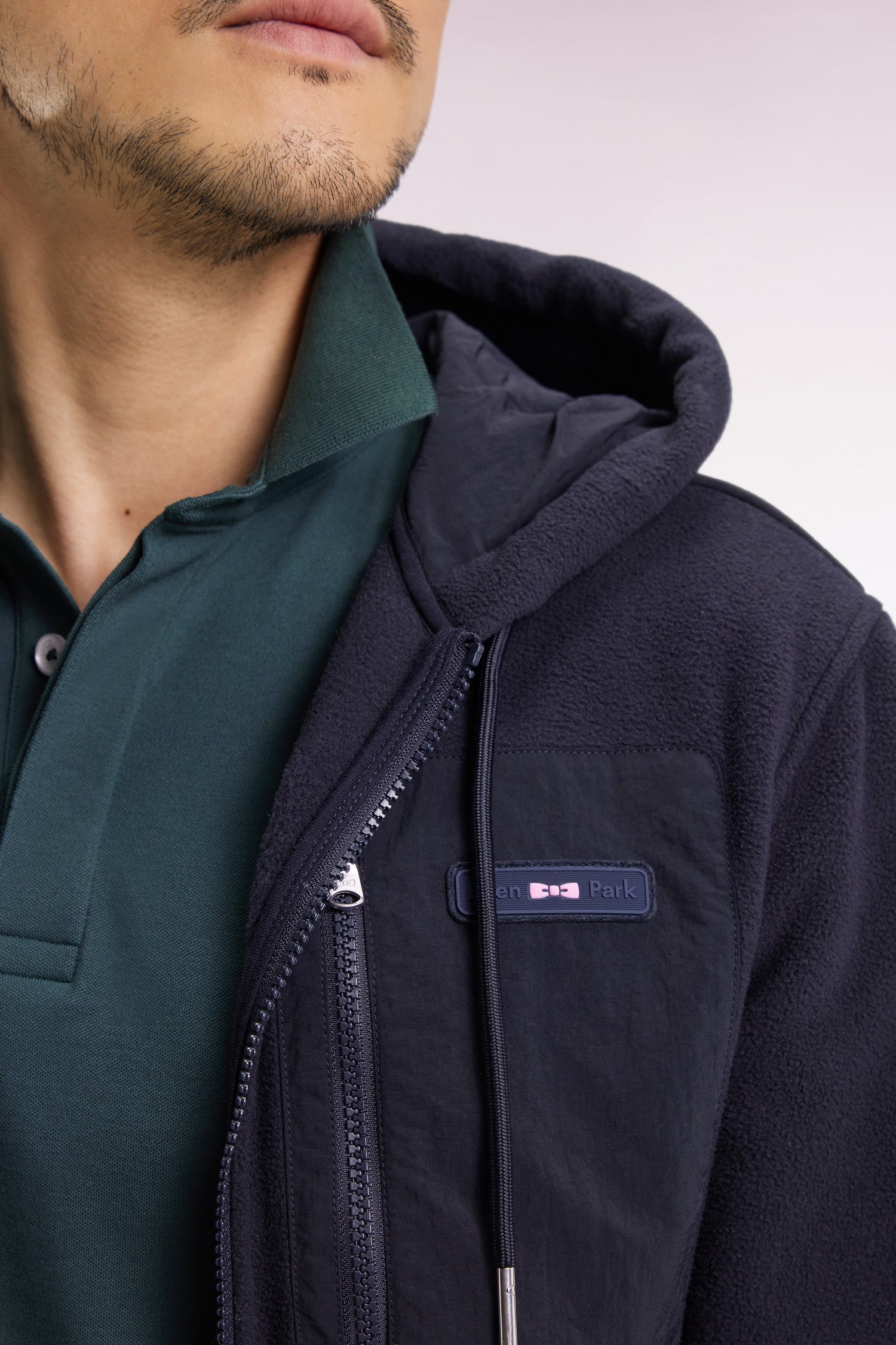 Navy two-color hooded sweatshirt with zip, straight cut