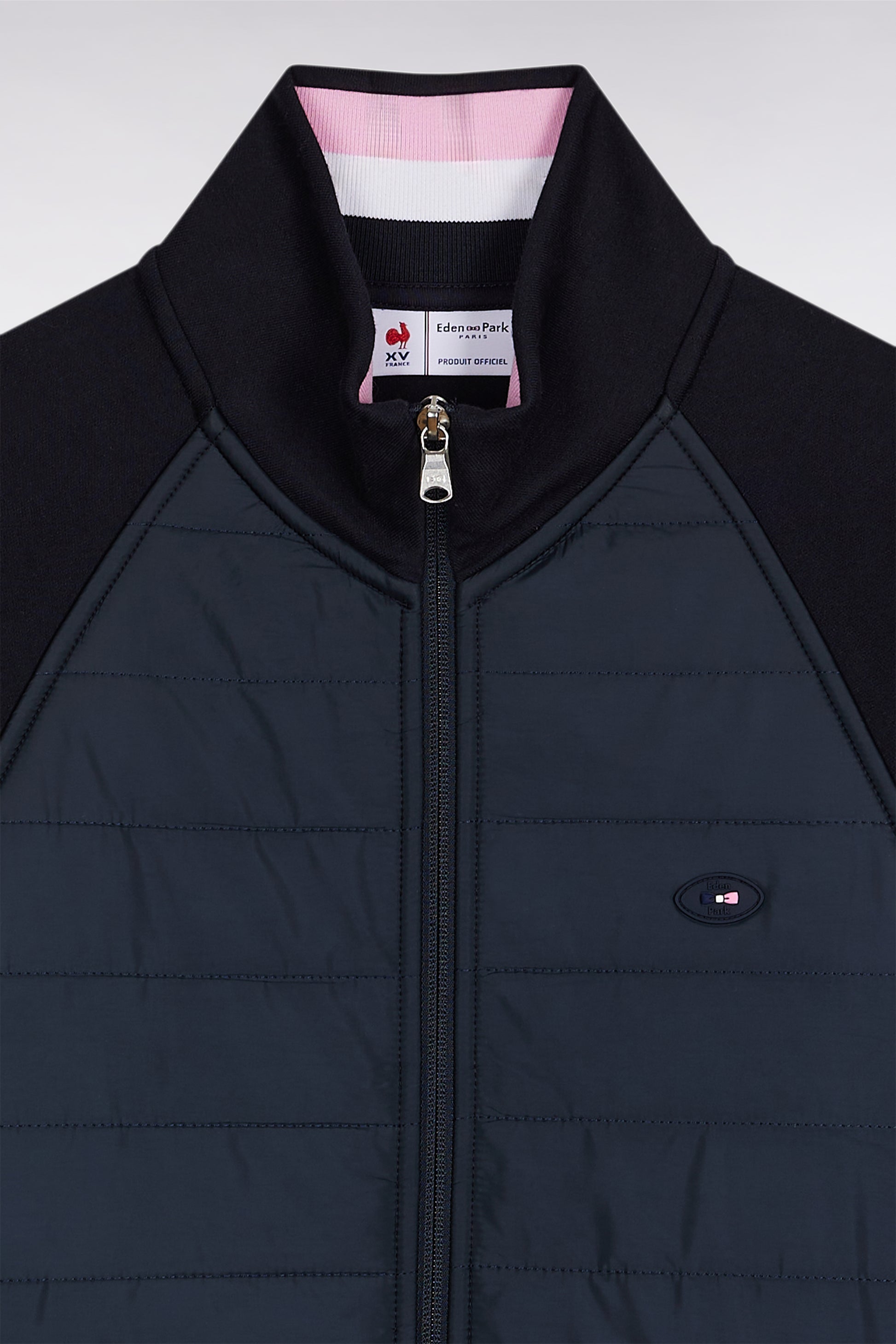 Designed in collaboration with the French Rugby Federation (FFR), this zip-up sweatshirt combines sporting spirit with top-of-the-range finishes. Designed as a lightweight jacket, it features a quilted nylon chest facing to structure the silhouette. Comfortable and protective, this bimaterial zip-up sweatshirt can be worn from mid-season onwards, for an athletic and elegant look. Official embroidery, FFR badge and tricolor details mark this emblematic piece, which can be worn well beyond the pitch for an urban silhouette with a sporty edge.