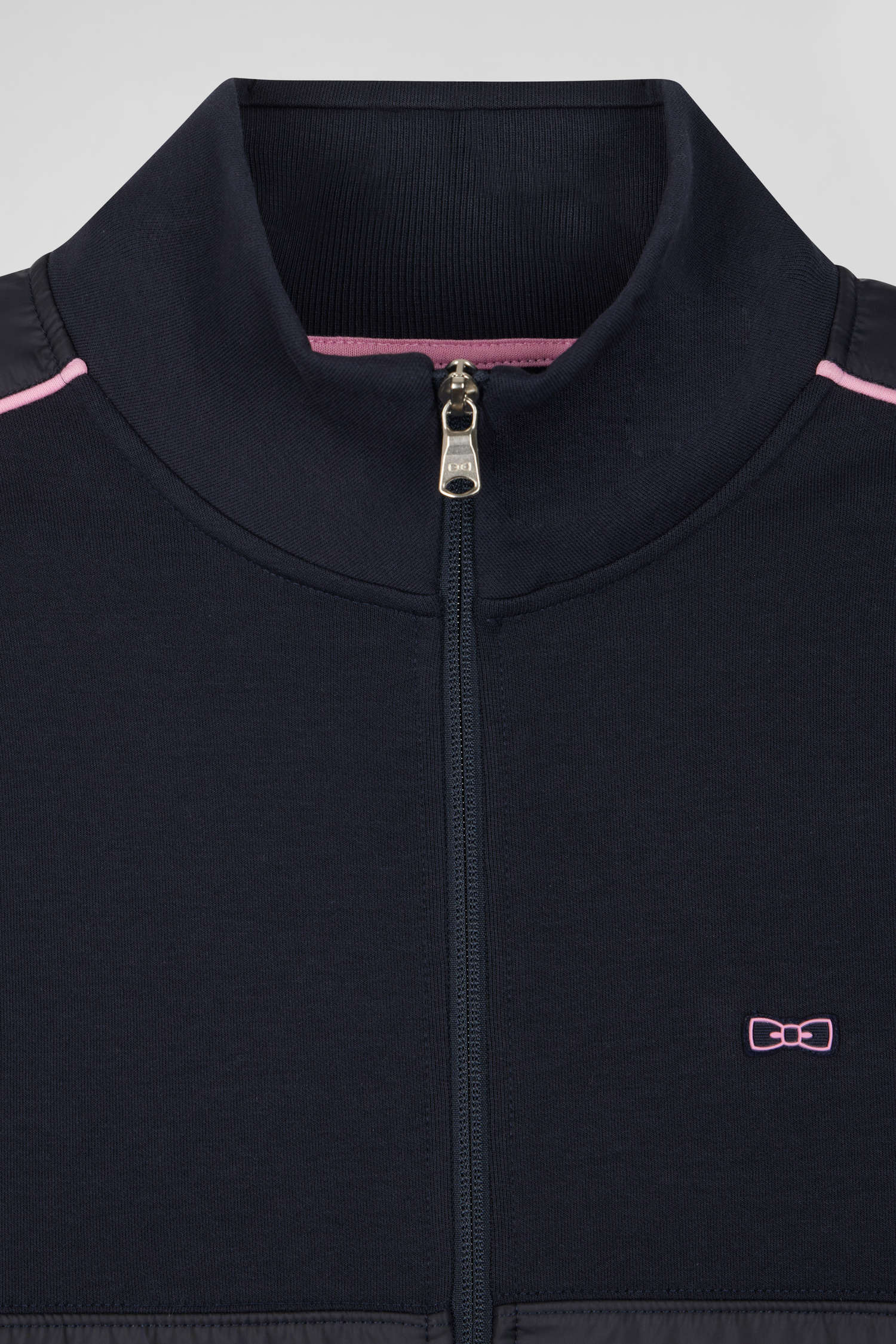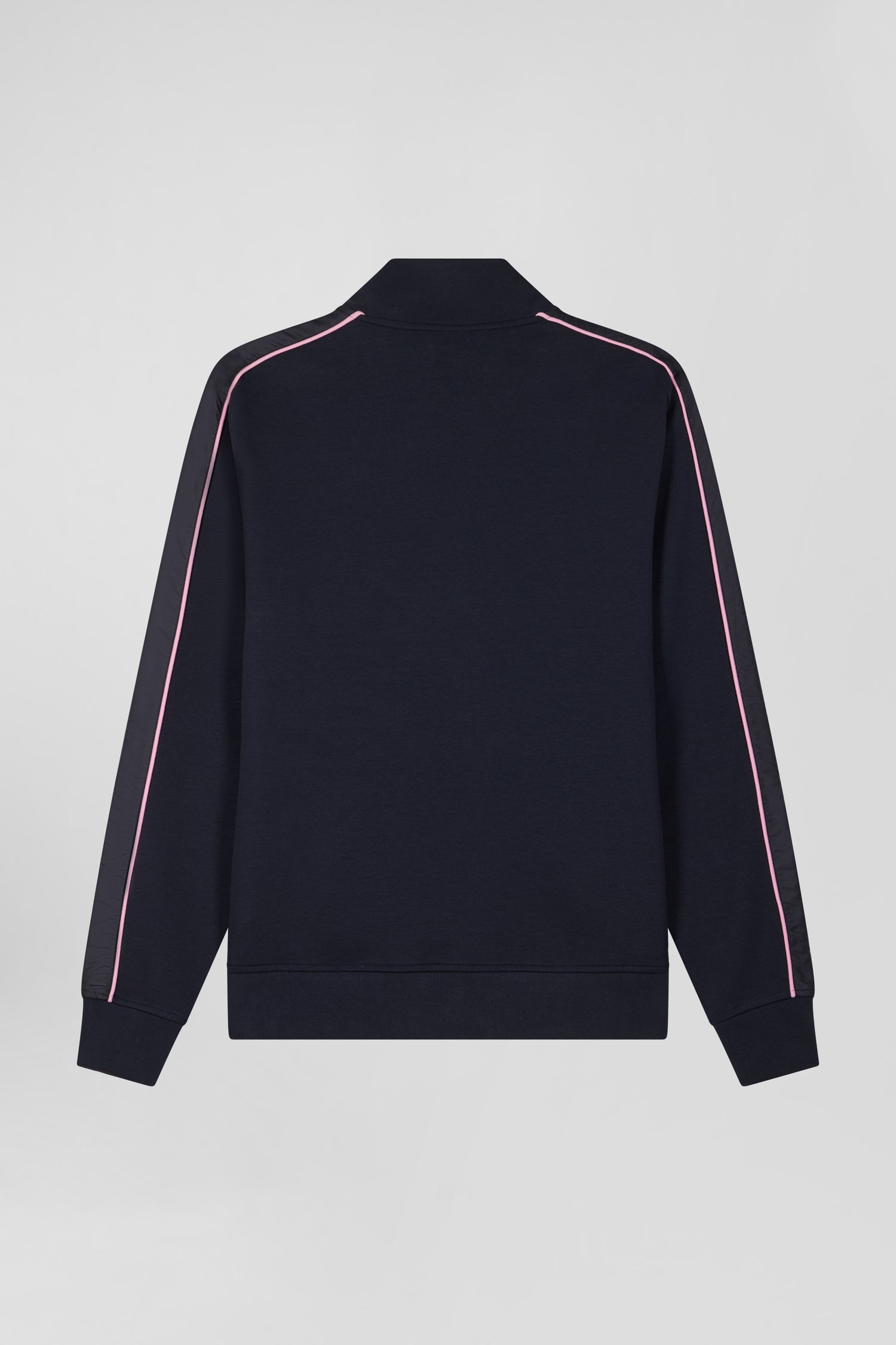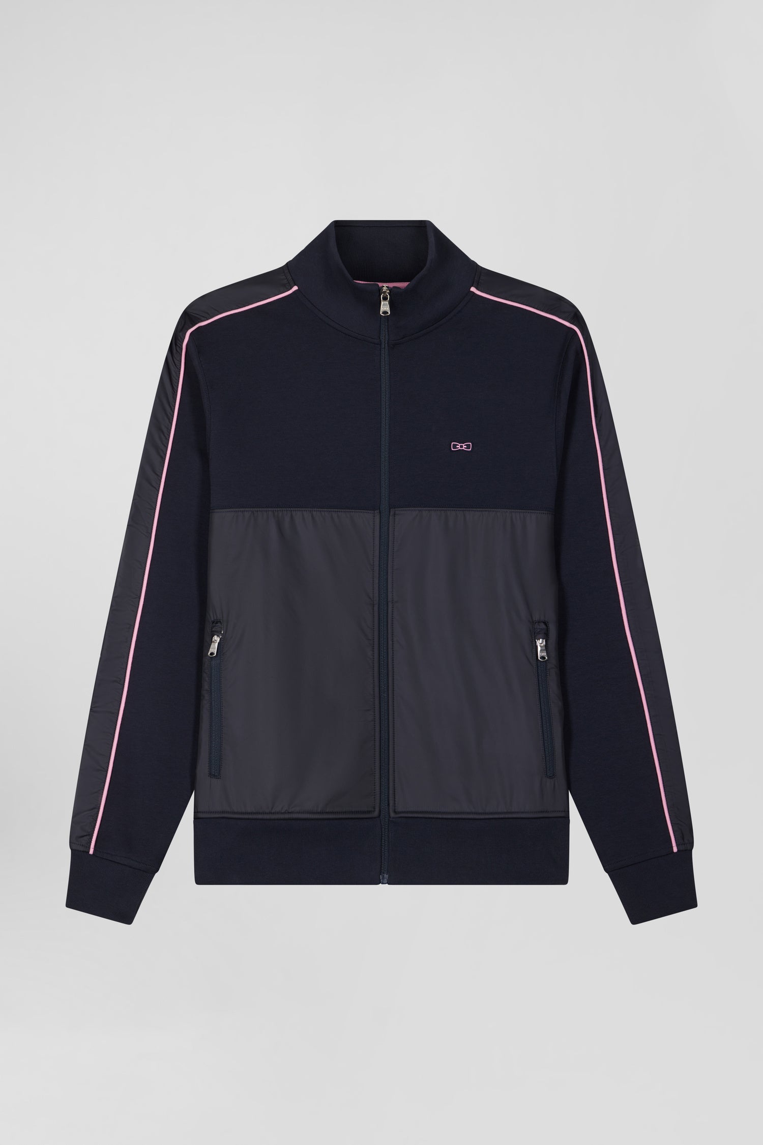 This zip-up interlock stand-up collar sweatshirt features nylon inserts on the sleeves and front, accented with elegant pink piping. The zipped stand-up collar and silver metallic finishing with our Maison's logo add a touch of refinement to this modern, functional garment.