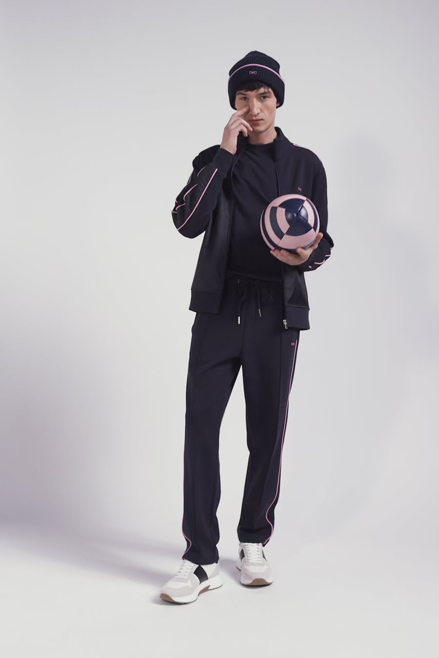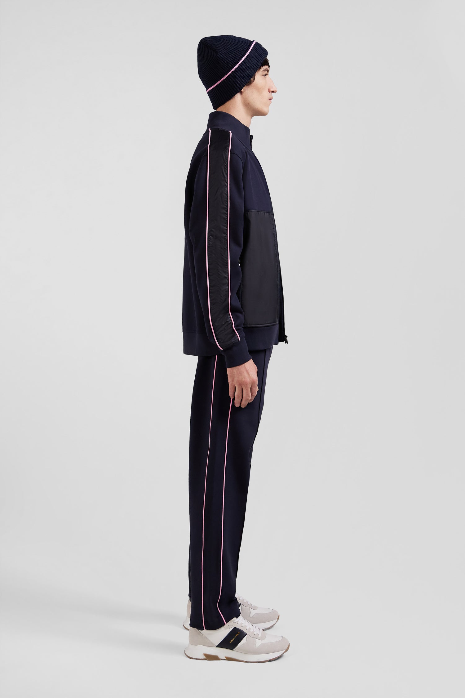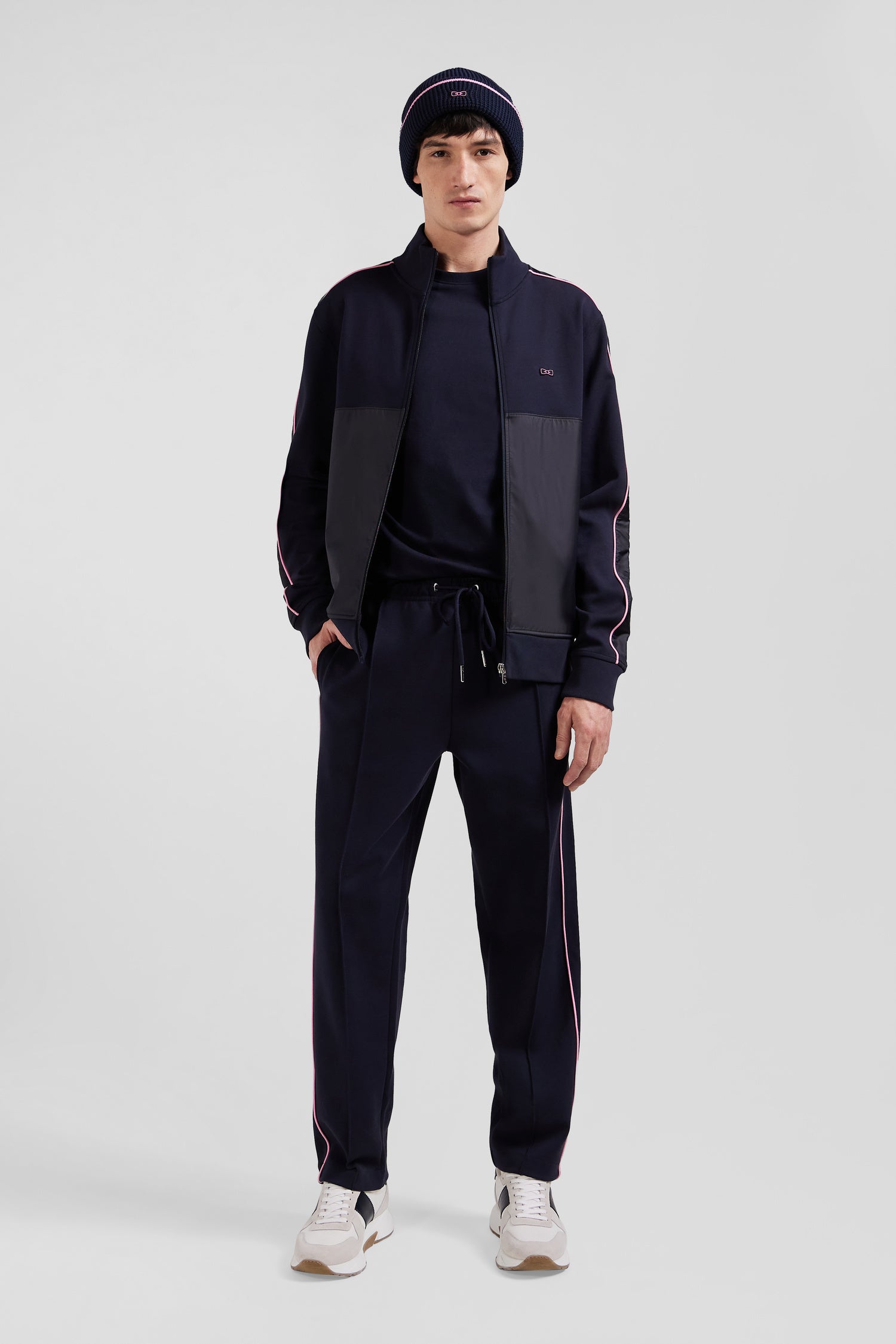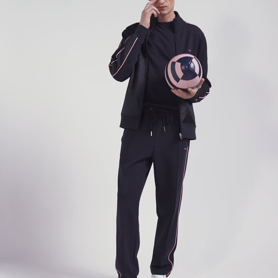 This zip-up interlock stand-up collar sweatshirt features nylon inserts on the sleeves and front, accented with elegant pink piping. The zipped stand-up collar and silver metallic finishing with our Maison's logo add a touch of refinement to this modern, functional garment.