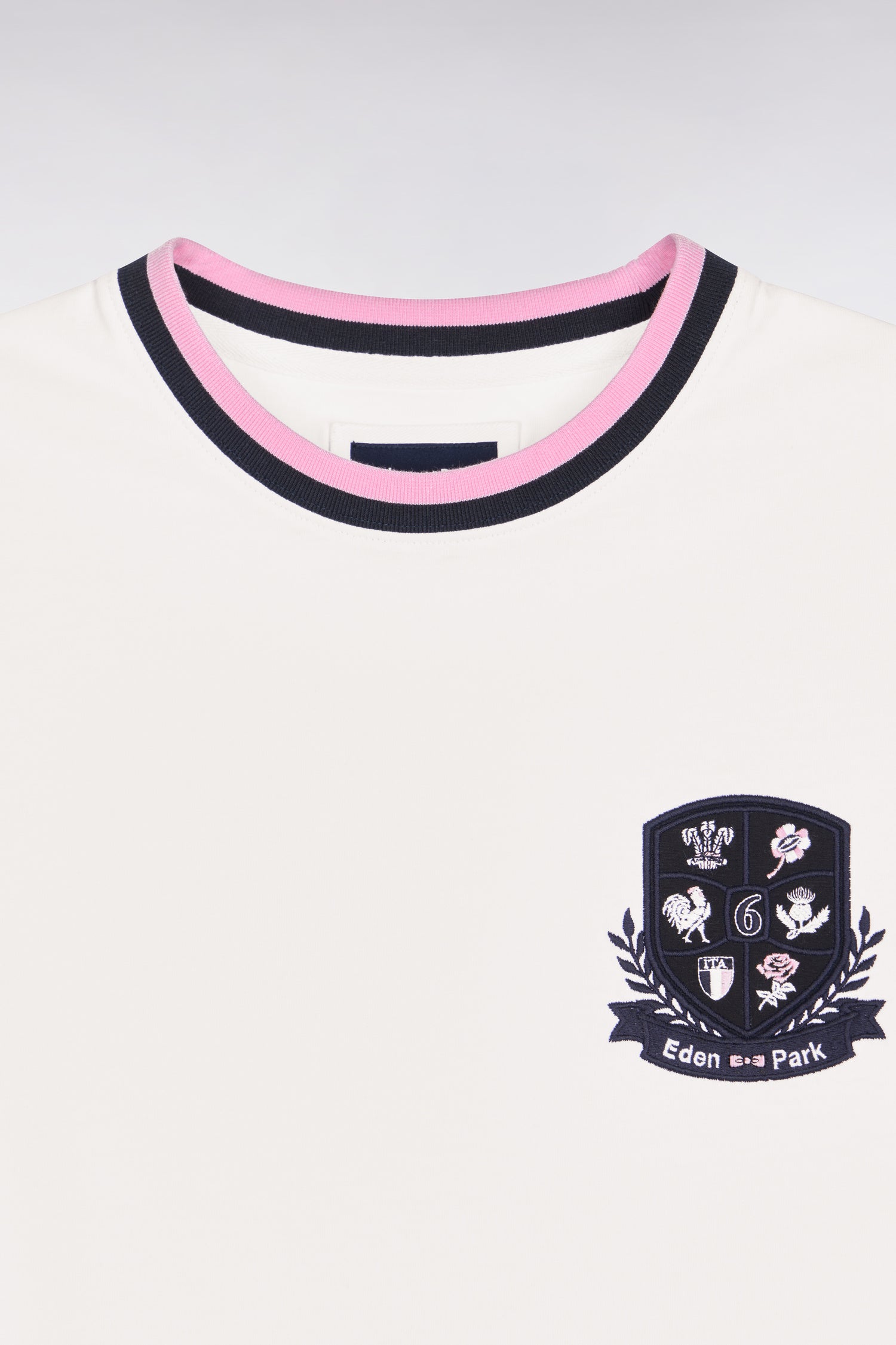Ce T-shirt homme associe une coupe droite confortable à un écusson hommage au Tournoi des 6 Nations qui signe son identité. Le port de tête est mis en valeur par un col rond aux finitions bords-côtes rayées pour une tenue durable. Une pièce facile à porter, conçue pour compléter une silhouette décontractée sans jamais en faire trop. Confectionné dans un jersey coton blanc de grande qualité.