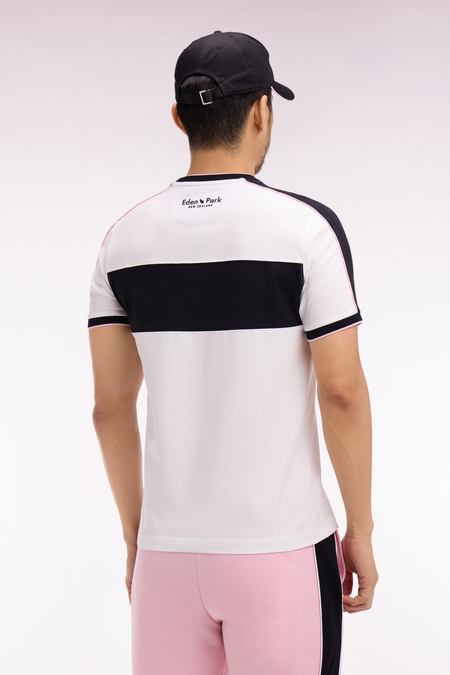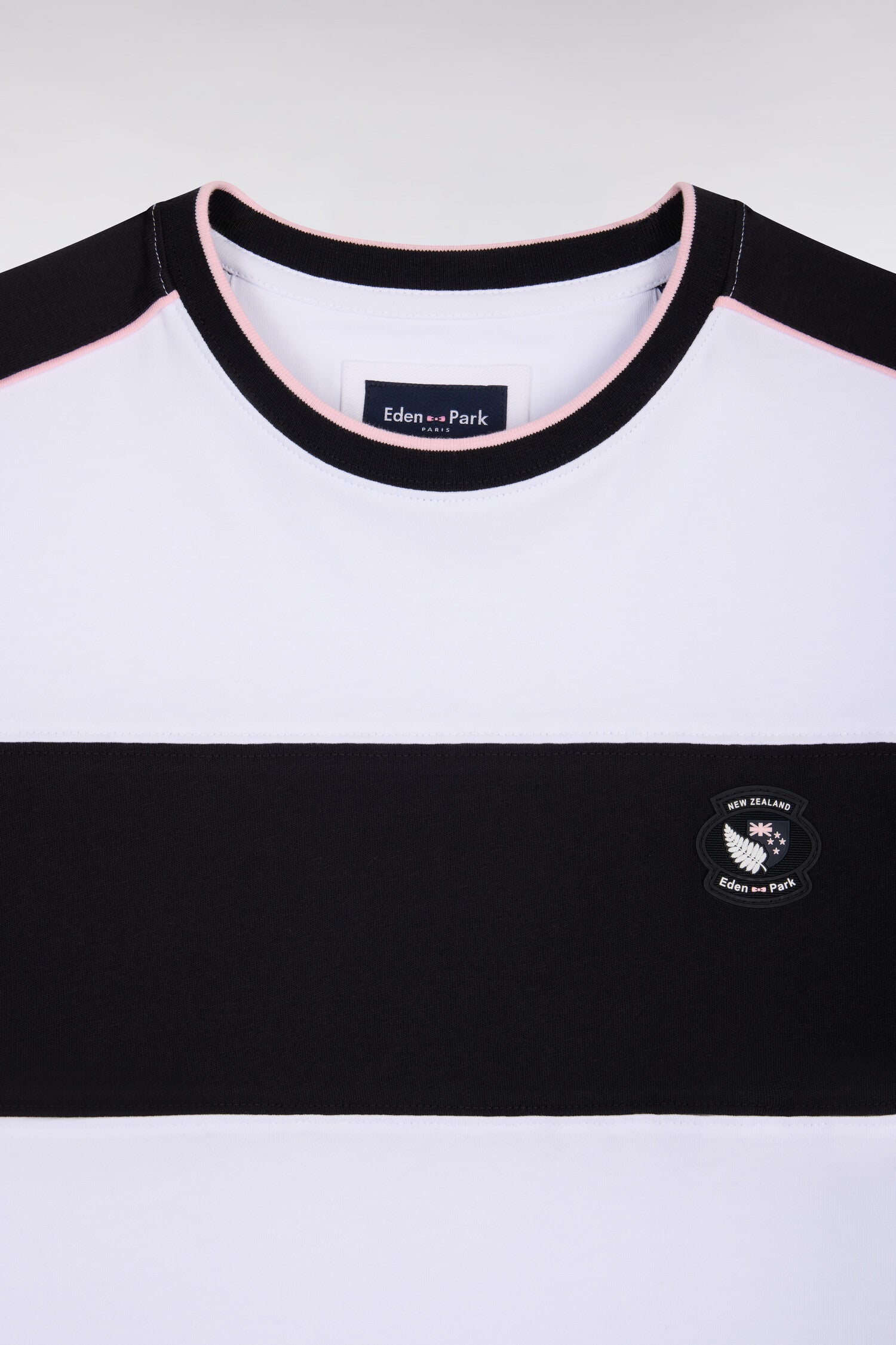 Ce T-shirt homme de notre capsule New Zealand est confectionné en jersey de coton blanc ou noir et se distingue par ses découpes et passepoils contrastés, noirs ou fuchsia selon le coloris choisi, et son badge sur la poitrine. Ses finitions bords-côtes rayées affirment son style sport-chic emblématique de nos créations.