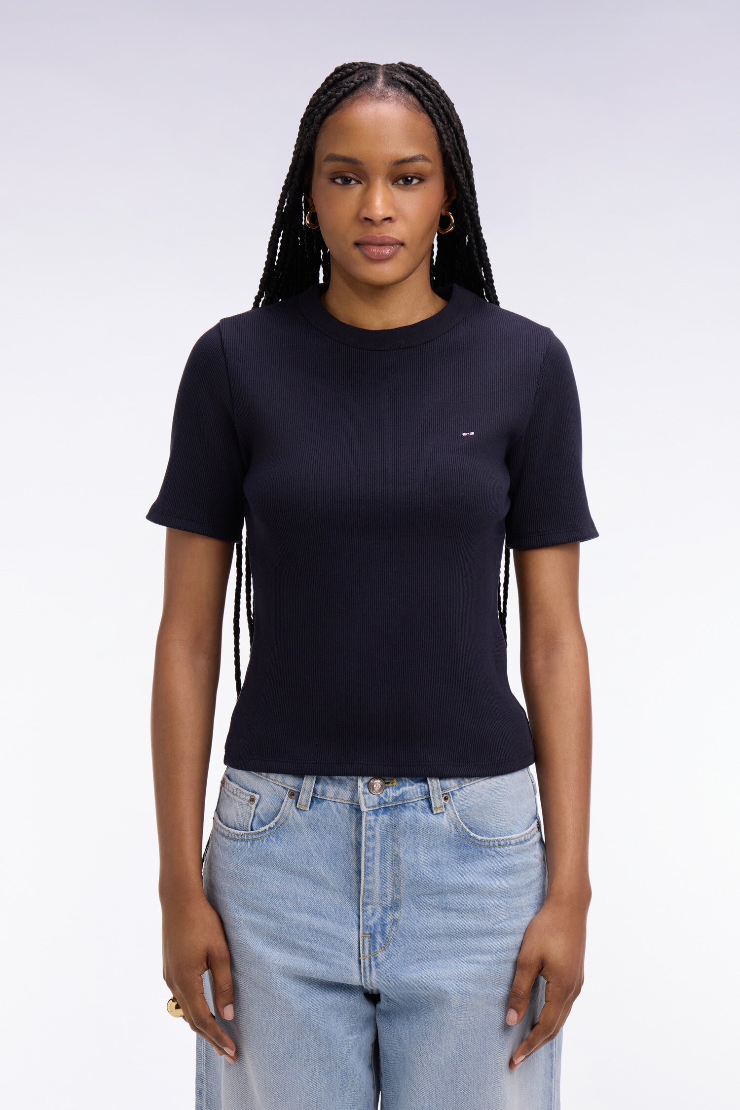 Ce t-shirt femme encolure ronde à la coupe slim ajustée est confectionné en modal et coton pour vous offrir un toucher naturellement doux et confortable. Son tricotage côtelé met subtilement en valeur la silhouette, tandis que le nœud papillon rose brodé sur la poitrine signe cet intemporel avec discrétion. À porter sous une chemise ouverte, glisser dans un jean taille haute ou à associer à un cardigan léger pour une allure effortless chic en toutes occasions.