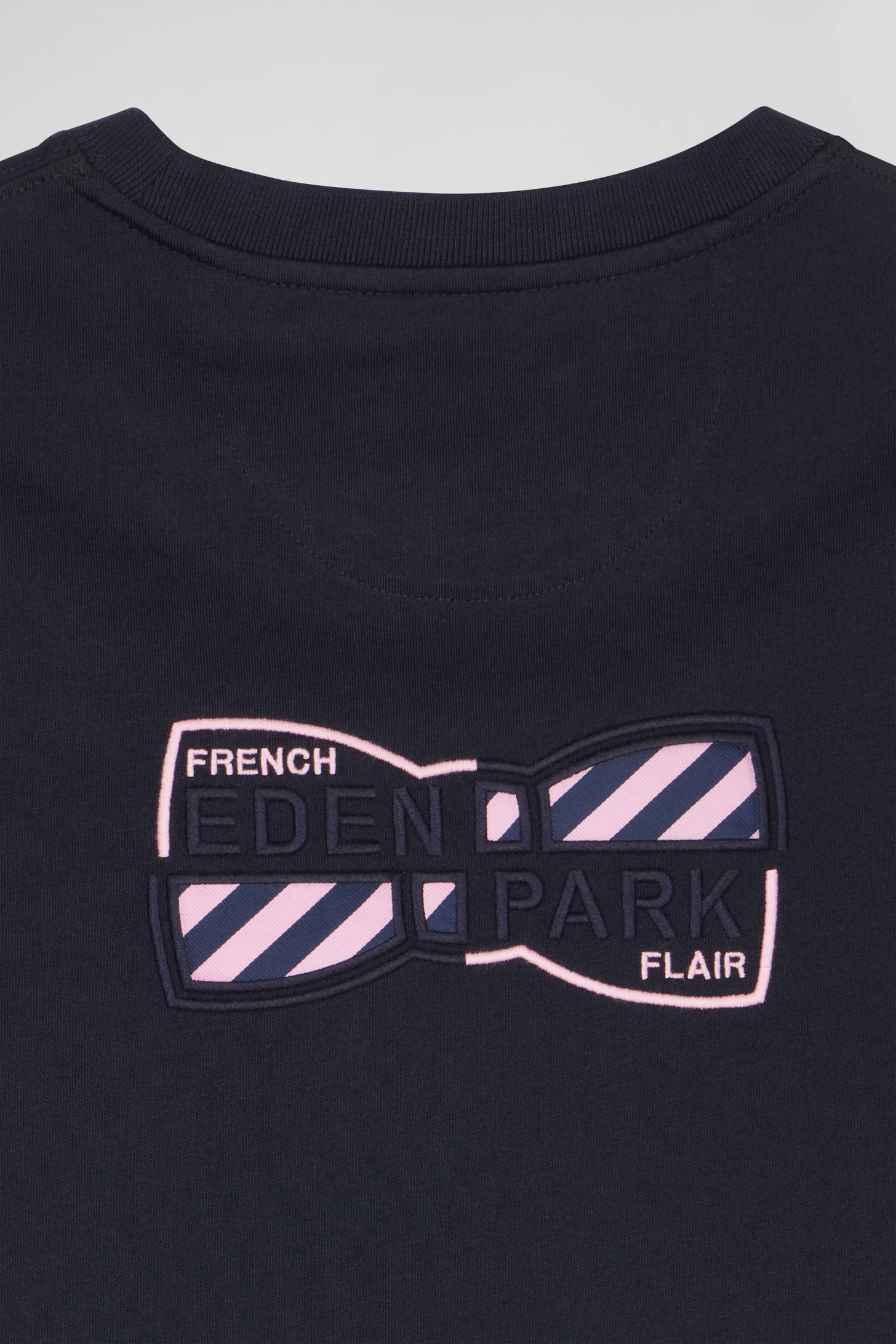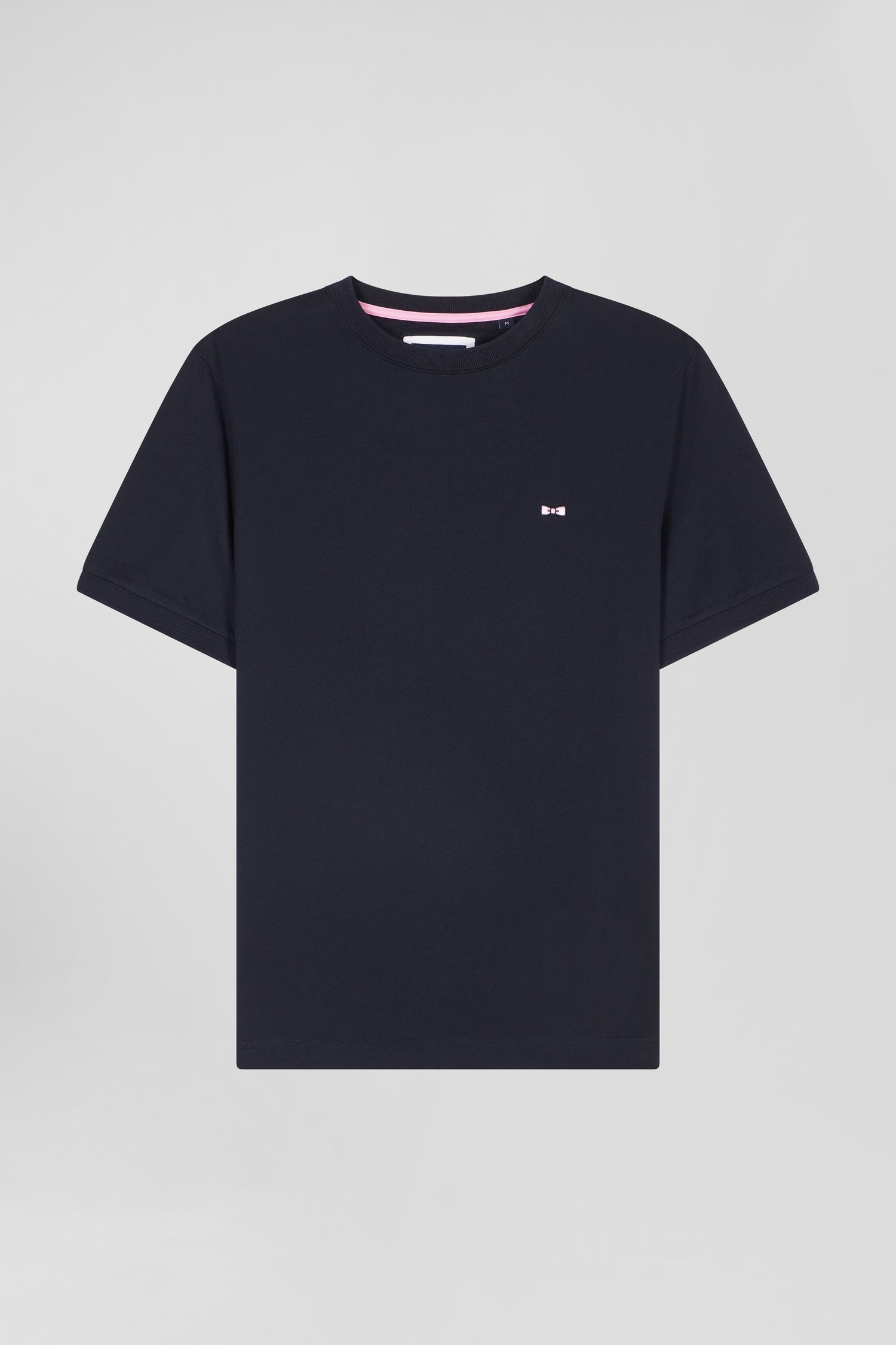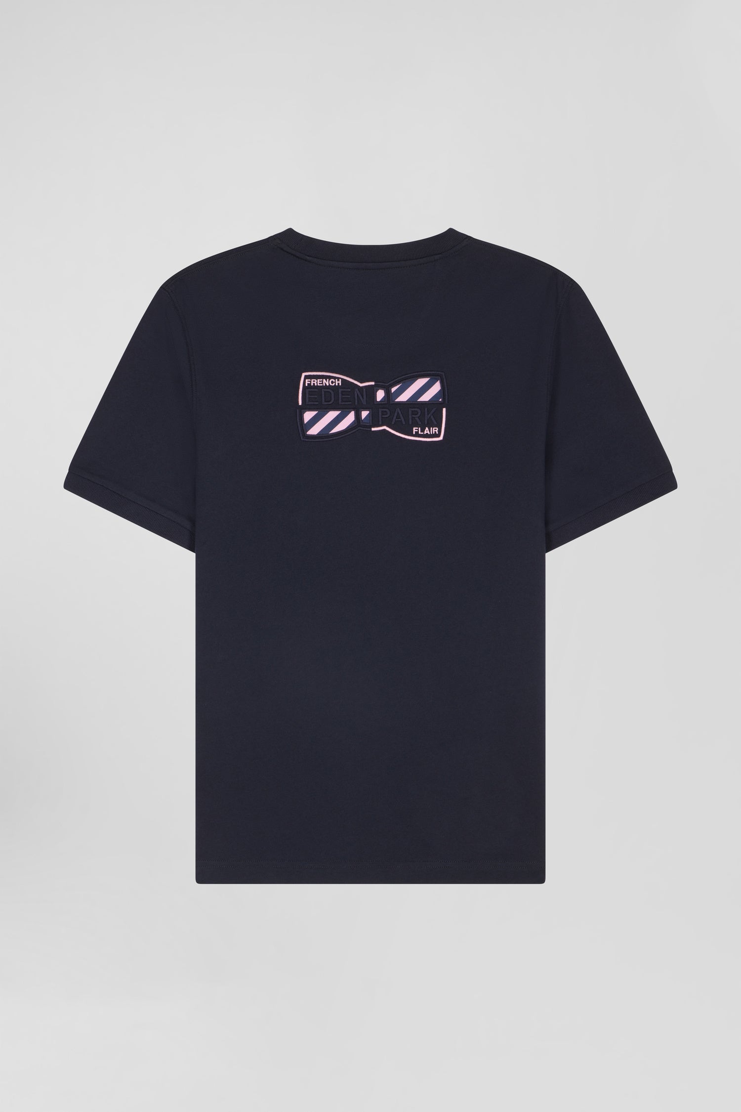 Regular navy short-sleeved cotton T-shirt with back emblem embroidery