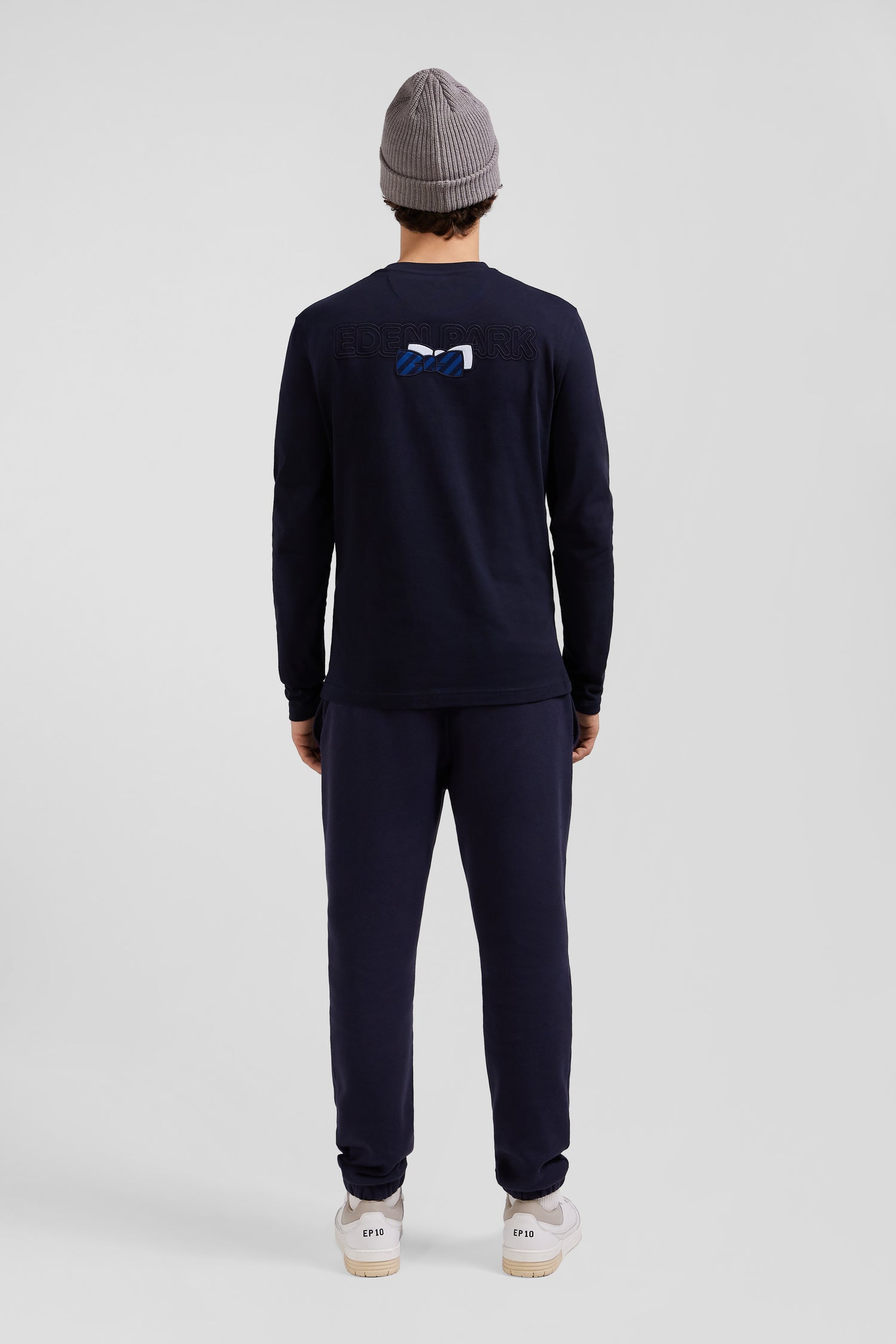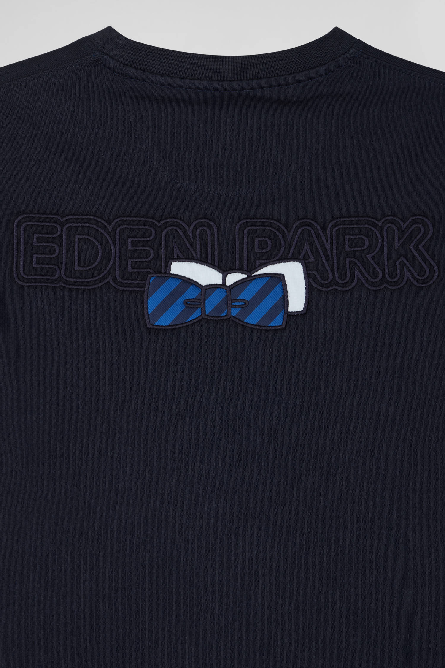 An Eden Park emblem, this long-sleeved T-shirt features back embroidery combined with the application of tie fabric. On the front, a double bowtie embroidery marks this model. Available in gray or navy, this soft cotton jersey T-shirt can be combined with any style statement.