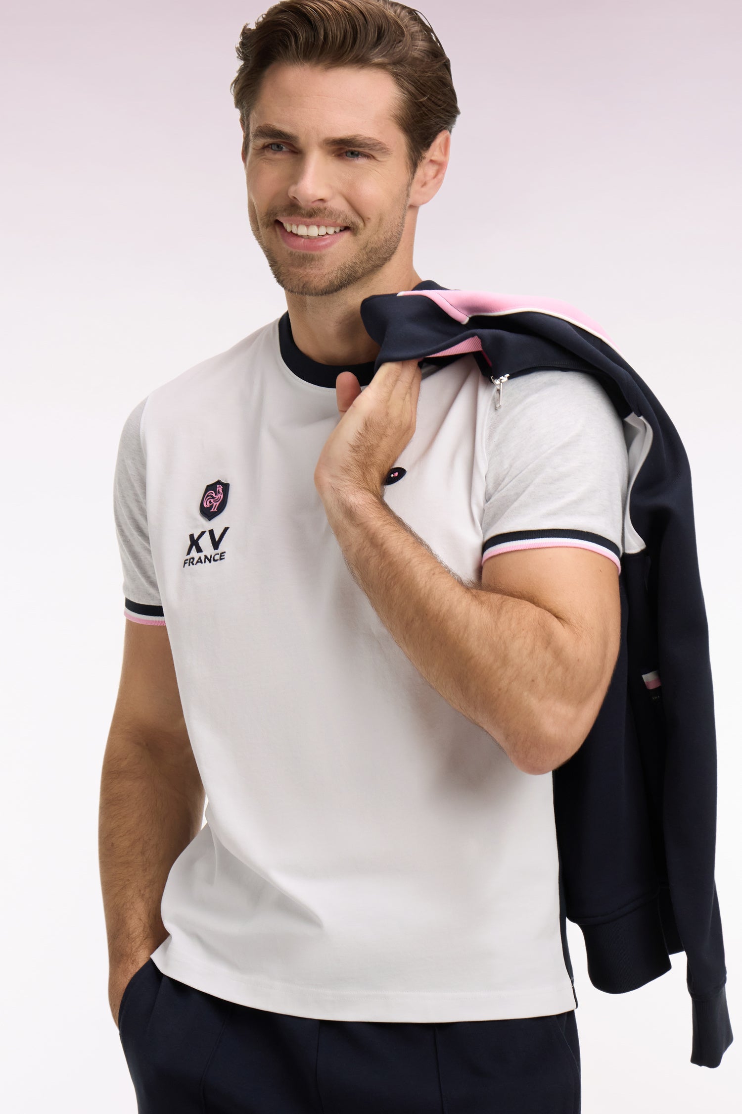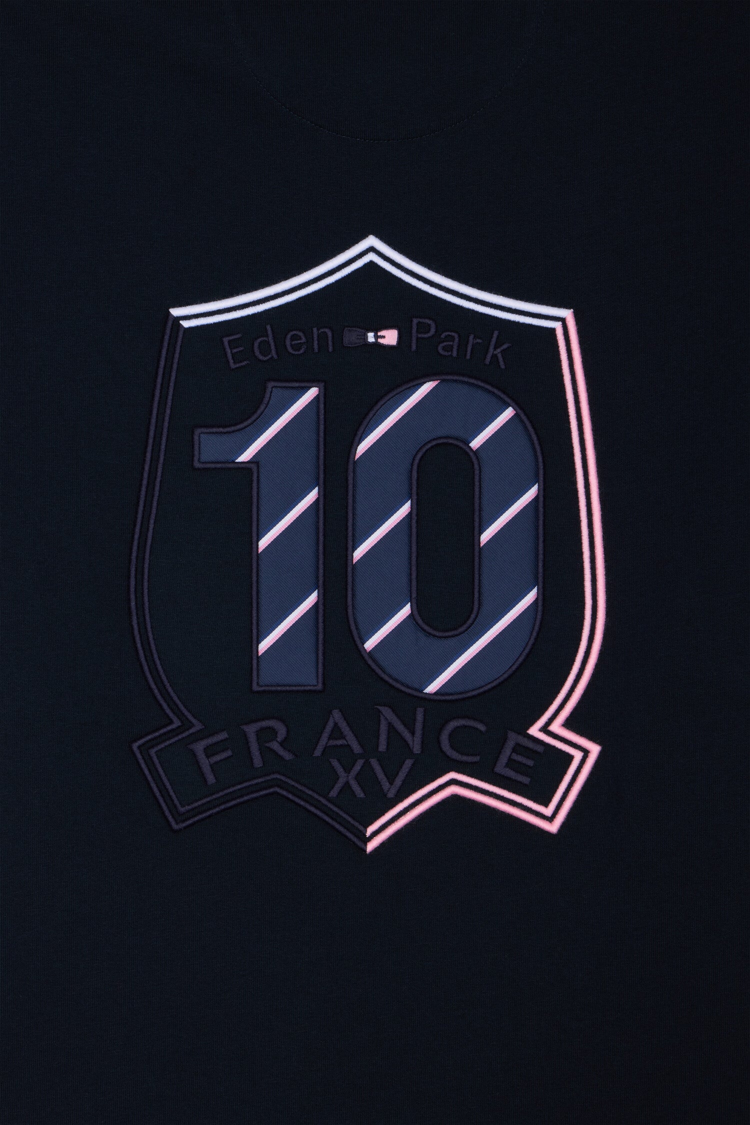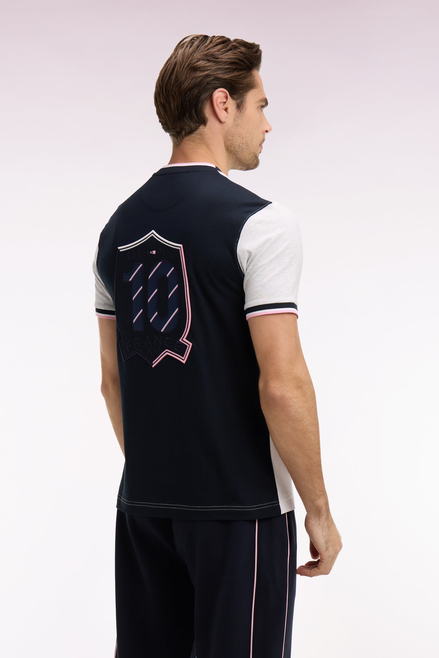 Ce T-shirt en jersey de coton à la coupe regular joue sur un contraste graphique entre dos marine, devant blanc et manches grises aux finitions bords-côtes. Au dos, une broderie exclusive rehaussée de tissu cravate rayé met en scène l’écusson XV de France, et le 10 signature forte de la Maison. Les finitions en bords-côtes rayés et le logo FFR sur la poitrine complètent ce modèle au style sport chic affirmé.