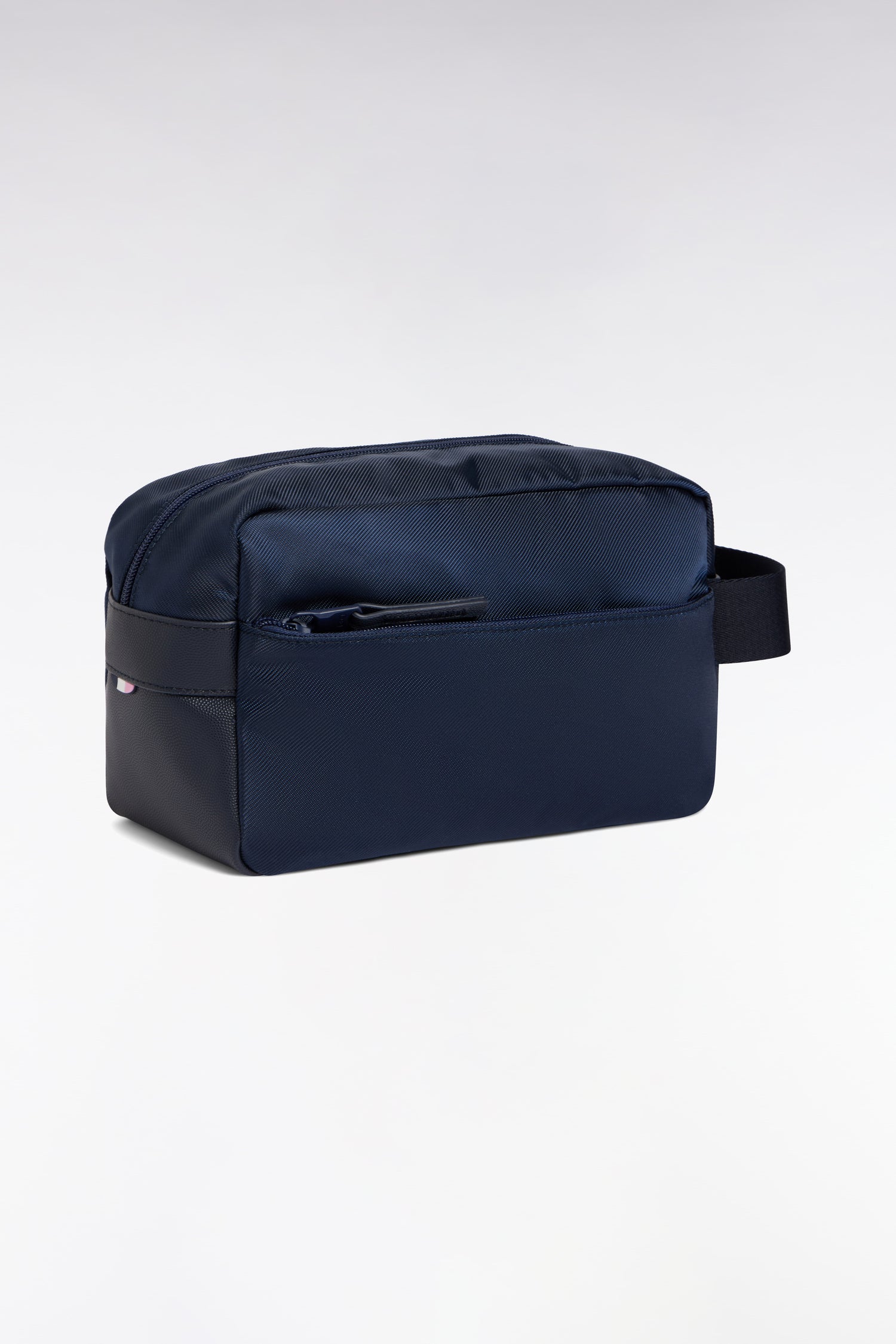This men's toiletry bag combines practicality and elegance. Featuring a zipped top closure, it opens onto an interior lined with navy and pink rugby stripes, structured by a zipped pocket and mesh compartment. An external zipped pocket on the back completes the package for quick access to your essentials. The chevron handle makes it easy to hold, while the bowtie emblem soberly marks this accessory designed for everyday use as well as travel. A functional accessory for yourself or as a gift.